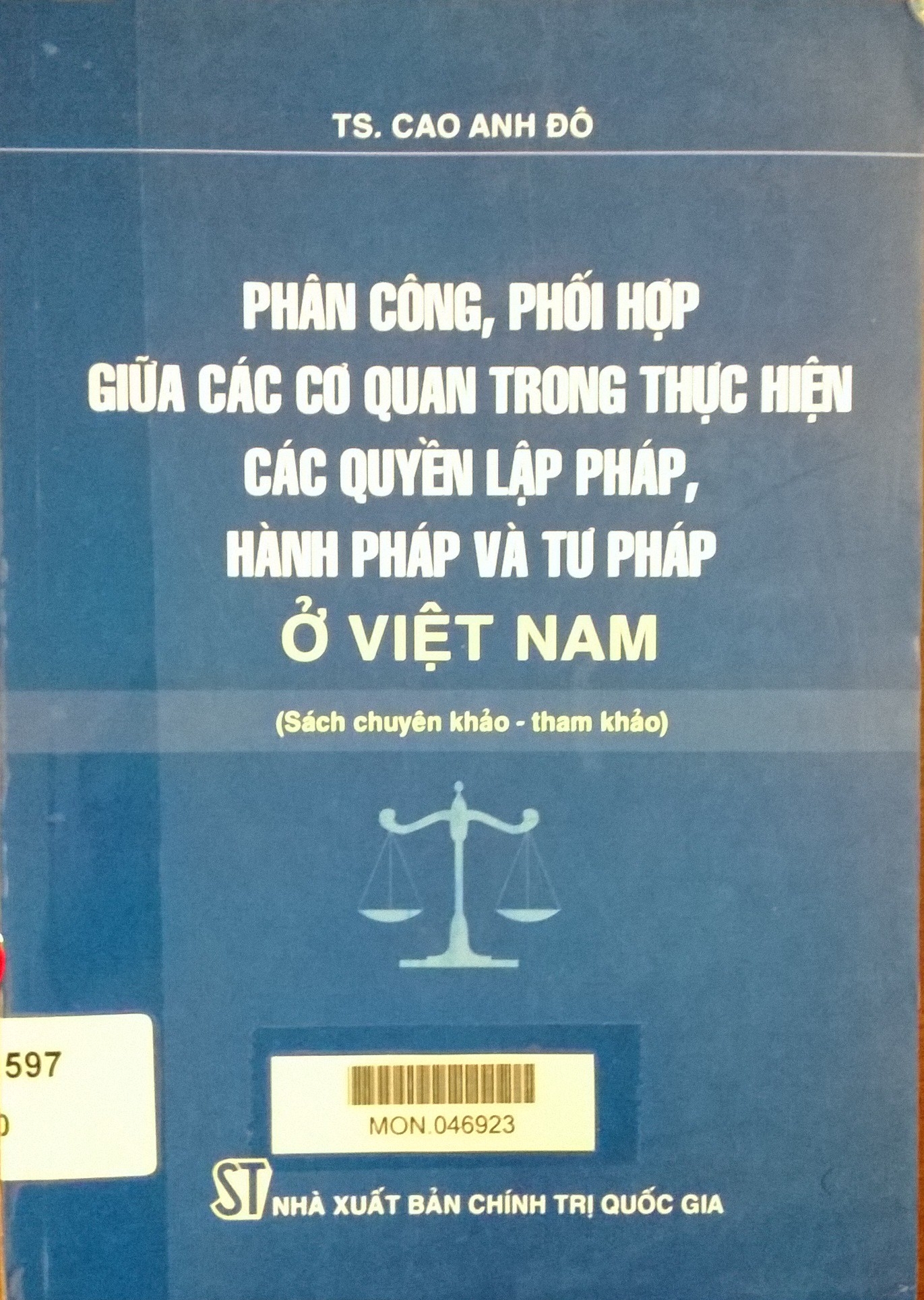 Phân công, phối hợp giữa các cơ quan trong thực hiện các quyền lập pháp, hành pháp và tư pháp ở Việt Nam : Sách chuyên khảo-tham khảo / Cao Anh Đô.- Hà Nội: Chính trị Quốc gia, 2013.- 230 tr., 21 cm