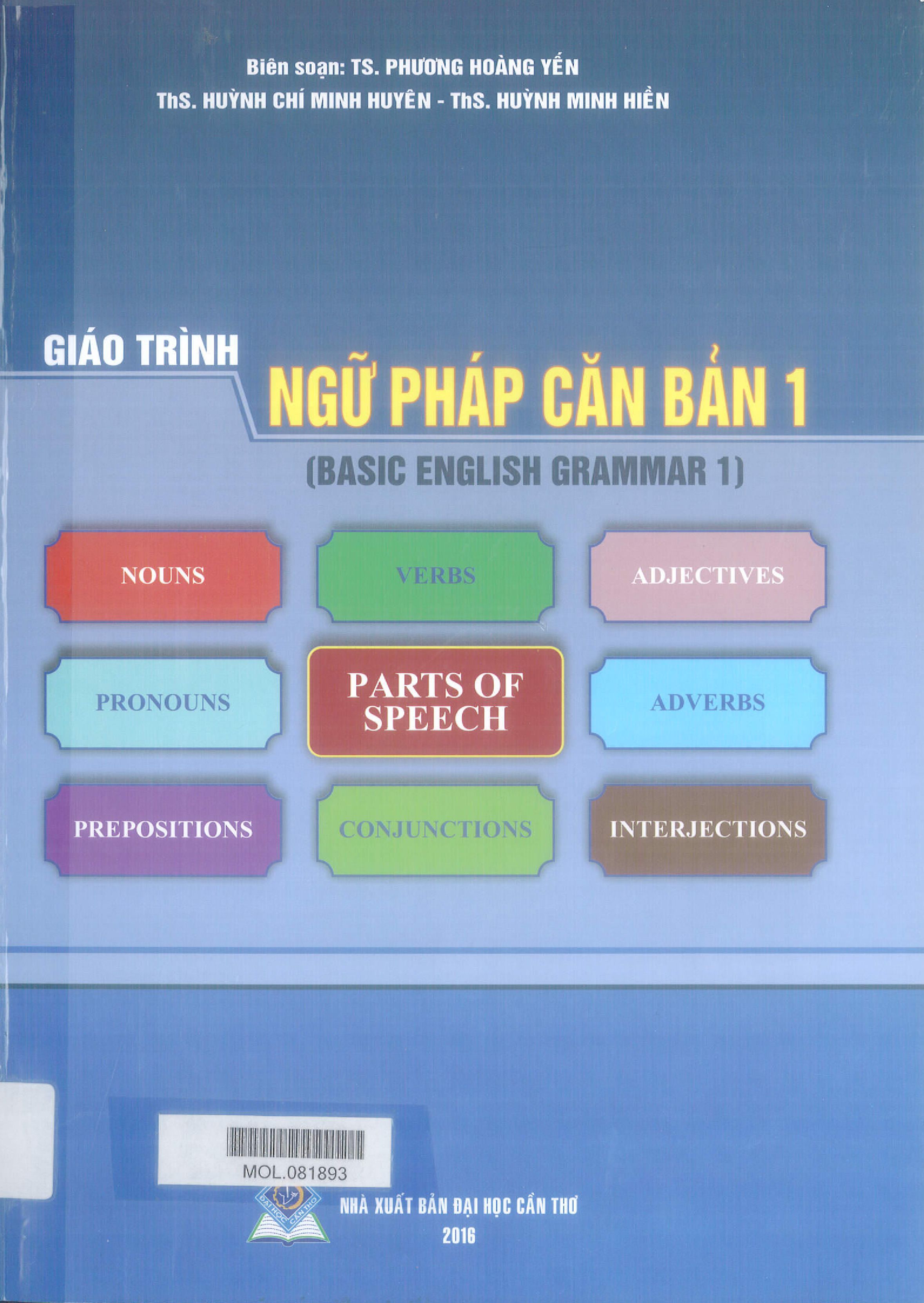Giáo trình ngữ pháp căn bản 1 = Basic English Grammar 1 / Phương Hoàng Yến, Huỳnh Chí Minh Huyên, Huỳnh Minh Hiền. – Cần Thơ : Nxb. Đại học Cần Thơ, 2016. – 364 tr. ; minh họa, 29 cm, 9786049197017. – 425/ Y603